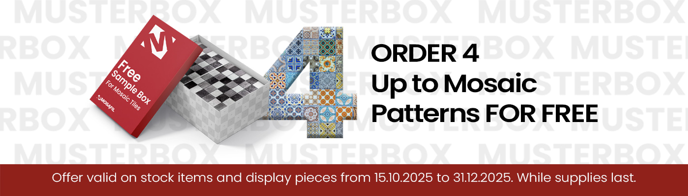 Offriamo costantemente un'ampia selezione di mosaici e piastrelle di alta qualità per bagni e WC, piscine, corridoi, soggiorni, nonché terrazze e vialetti. Da noi troverai varie piastrelle, piastrelle da parete, piastrelle da pavimento, gres porcellanato, bordure e mosaici in vetro, come mosaici in pietra naturale, rivestimenti murali, pannelli, mosaici per piscina, ciottoli di fiume, mosaici effetto legno, mosaici metallici, mosaici in pietra naturale, mosaici in acciaio inox, mosaici in alluminio, frammenti di marmo, mosaici in marmo, mosaici da cucina, piastrelle da cucina, piastrelle in pietra naturale, travertino, ardesia e piastrelle da bagno. Mosaici per bagno con molte possibilità di design. Lasciati ispirare dalle varie forme, materiali e colori! Sfoglia le nostre categorie di prodotti 24 ore su 24, che aggiorniamo continuamente con nuovi articoli. Ordina facilmente da casa le piastrelle o i mosaici desiderati – come campioni o nella quantità necessaria. Consegnamo rapidamente e in sicurezza in tutta Europa. Saremo lieti di consigliarti personalmente e creare con te offerte su misura.