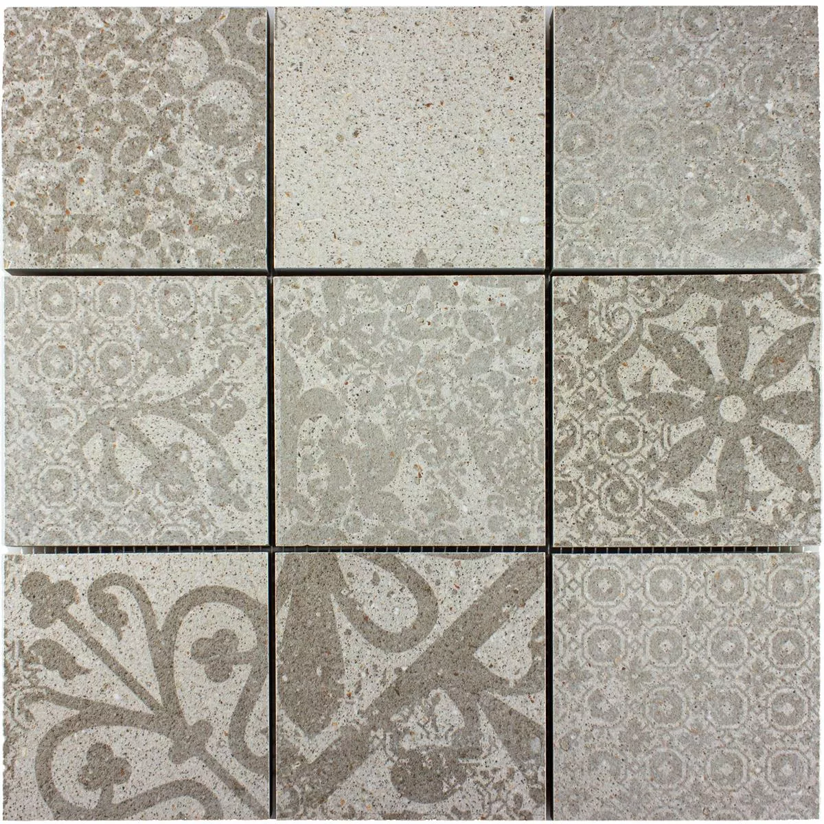 Con una dimensione della pietra di 95x95 mm e una dimensione della piastrella di 29x29 cm per tappetino in formato quadrato, la piastrella Eylem consente schemi di posa attraenti e strutturati. Il suo spessore di 10 mm garantisce una superficie solida e durevole.