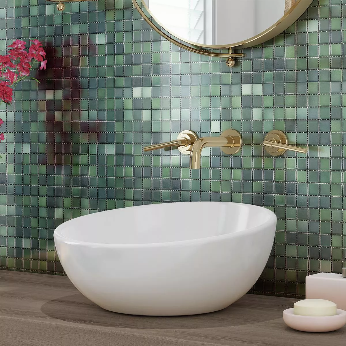 Con una larghezza delle fughe di 2 mm garantisce una posa pulita e uniforme che mette in risalto in modo ottimale l'effetto metallo misto verde della piastrella. Il mosaico Galleria unisce l'estetica moderna ai vantaggi pratici e dona un tocco di stile a ogni stanza.