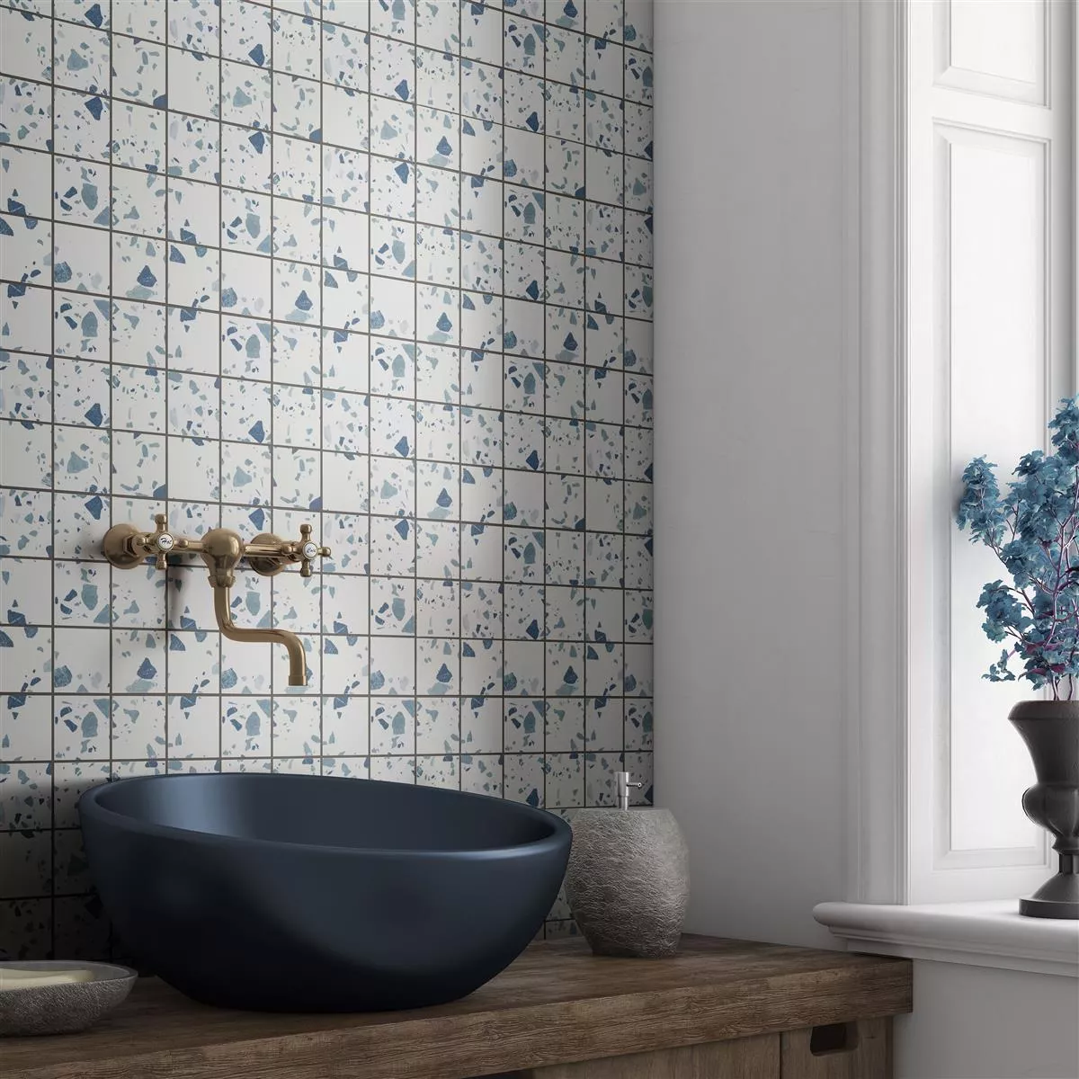 Queste piastrelle versatili possono essere utilizzate come piastrelle da rivestimento, mosaico o pavimento e la loro finitura opaca conferisce un aspetto di pietra naturale. La rilassante combinazione di colori blu crea un ambiente rilassante, perfetto per bagni, zone umide, cucine, aree interne, soggiorni e docce.