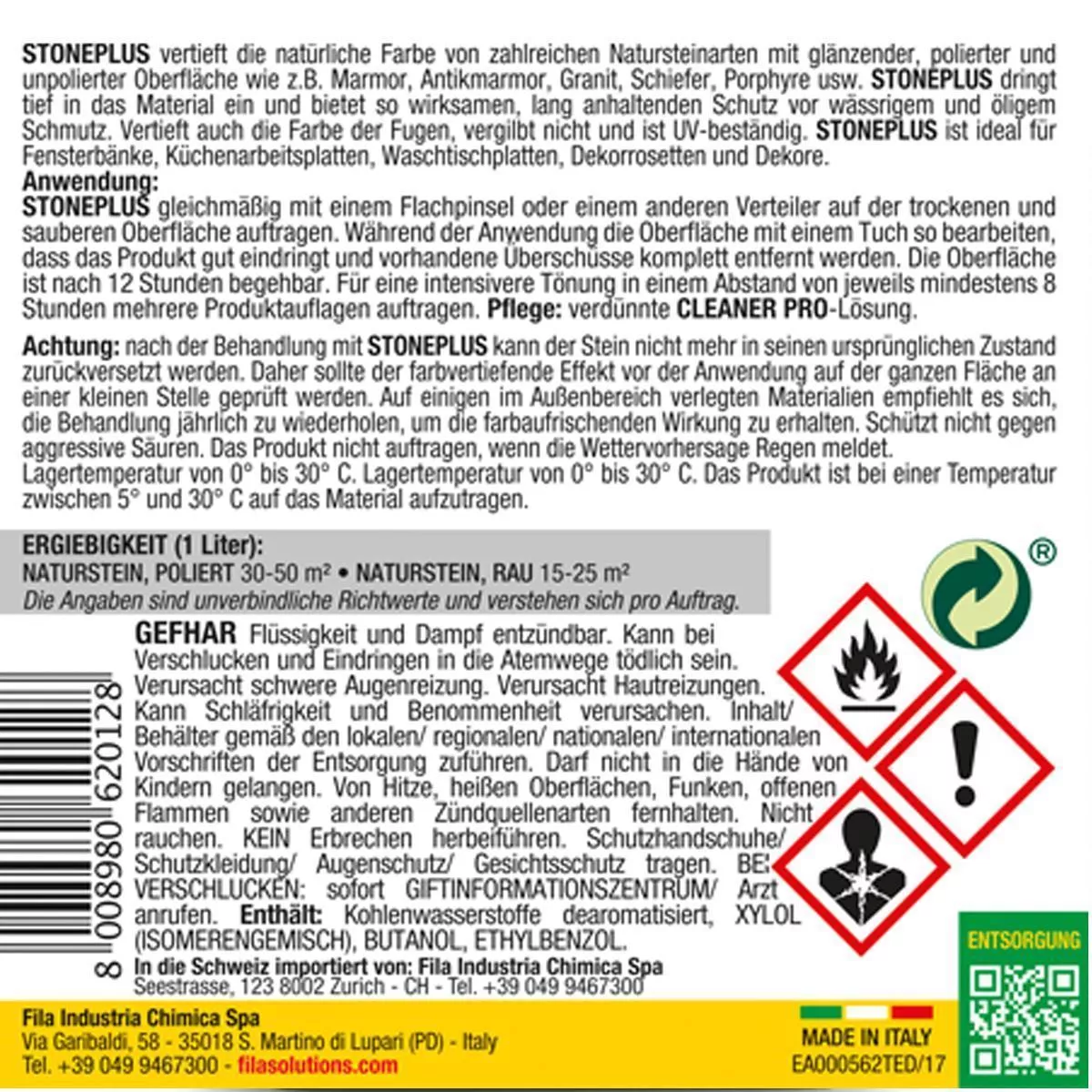 Dopo il trattamento con STONE PLUS la pietra non potrà più essere riportata allo stato originario. Pertanto, l'effetto di intensificazione del colore deve essere testato su una piccola area prima dell'uso su tutta la superficie. Su alcuni materiali posati all'esterno si consiglia di ripetere il trattamento annualmente per mantenere l'effetto ravvivante del colore. Non protegge dagli acidi aggressivi. Non applicare il prodotto se le previsioni meteo prevedono pioggia.