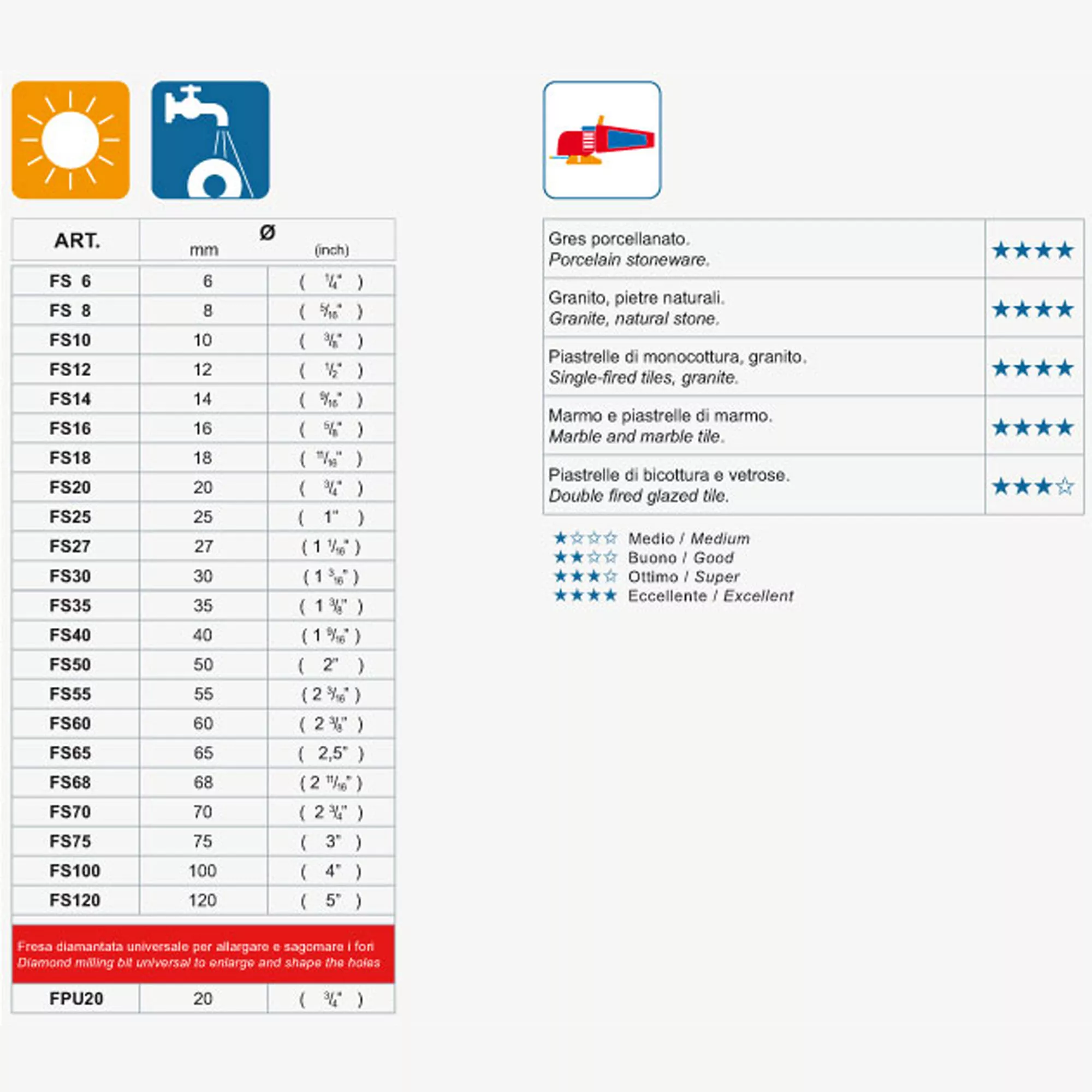 Con la corona diamantata, hai molte opzioni per praticare un ottimo foro. Poiché il diamante è noto per essere il minerale più forte al mondo, hai un lavoro molto pulito e preciso, che puoi identificare con questo trapano in qualsiasi momento. È possibile eseguire la perforazione a secco con il trapano. Questo è molto facile e funziona sempre. Inoltre, il risultato è molto preciso e fine. Puoi anche lavorare molti altri materiali con questo trapano. Questo include anche la ceramica. È spesso il caso della ceramica che si rompe durante la perforazione e l'intero oggetto si rompe. Questo non è il caso qui. Con il trapano hai sempre un ottimo risultato. Anche il granito, una pietra molto dura, può essere facilmente perforato con la punta del trapano. In questo modo puoi assicurarti che anche questo lavoro possa essere svolto facilmente. Il gres porcellanato è anche facile da lavorare.