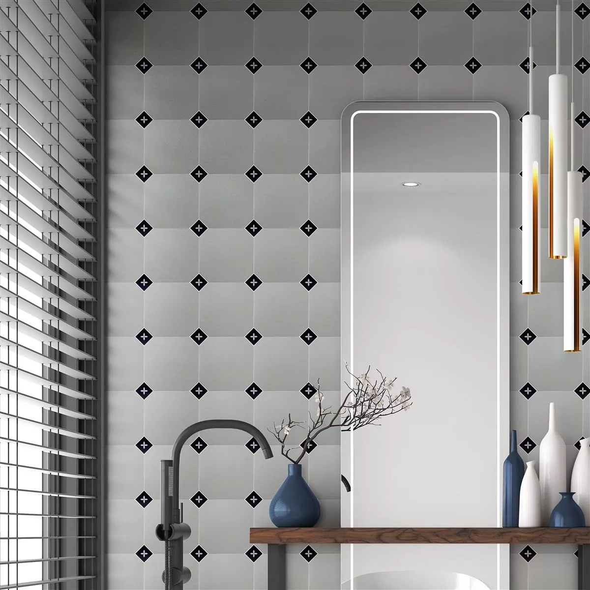 Le piastrelle in gres porcellanato con inserti Genexia Black White Decor 2 portano una varietà di stile ed un'eleganza senza tempo nella tua casa. Il formato quadrato con finitura opaca dona ad ogni ambiente un tocco moderno.