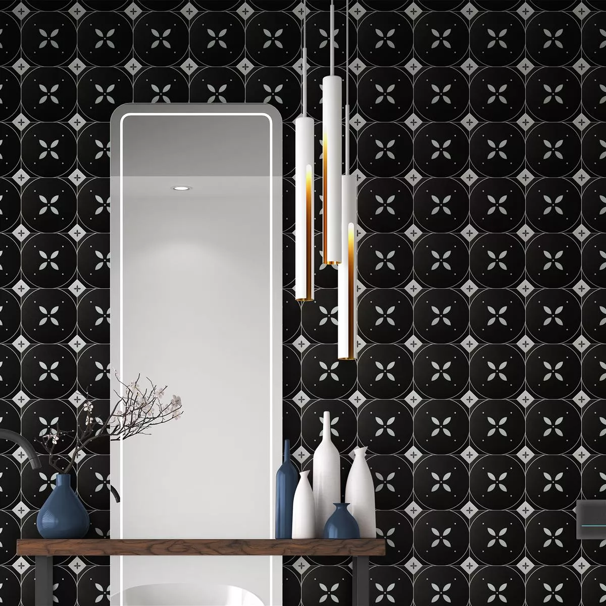 Le piastrelle in gres porcellanato a intarsio Genexia Black White Decor 1 donano ad ogni ambiente un'eleganza senza tempo. Il formato quadrato con finitura opaca è adatto sia per pareti che per pavimenti, e il suo design decorativo in bianco e nero aggiungerà un tocco speciale alle tue stanze.