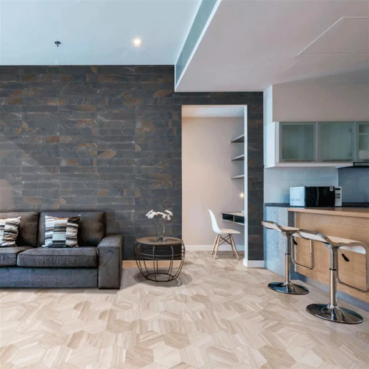 Le piastrelle Hexwood colpiscono per la loro superficie opaca e l'autentico aspetto del legno, che dona ad ogni stanza un'atmosfera calda e invitante. Con un grado di abrasione pari a 2, sono ideali per aree a traffico medio e sono perfetti per cucine, bagni, docce e altre aree umide, nonché spazi abitativi interni.