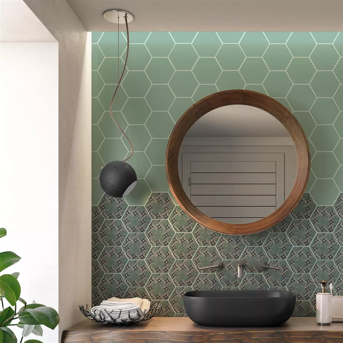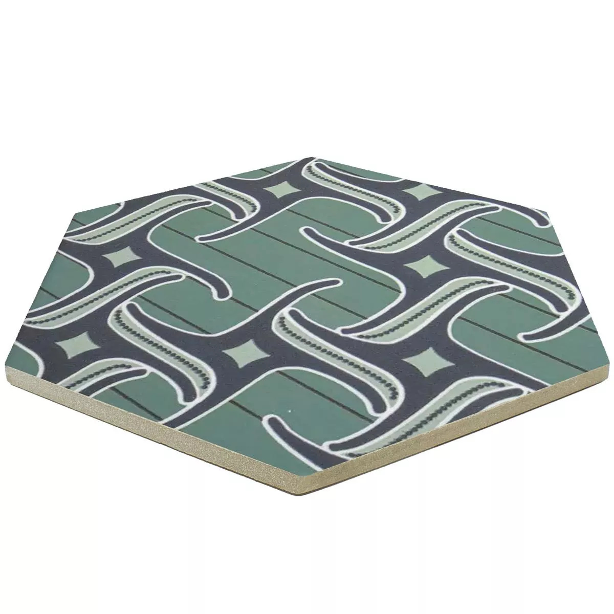 Le piastrelle in gres porcellanato “Modena Hexagon Decor 4” sono un'opera d'arte per il tuo ambiente. Con uno spessore di 10 mm sono perfetti per zone umide, docce, bagni, cucine, soggiorni e ambienti interni. La superficie opaca e il motivo ornamentale in verde-blu creano un'atmosfera unica.