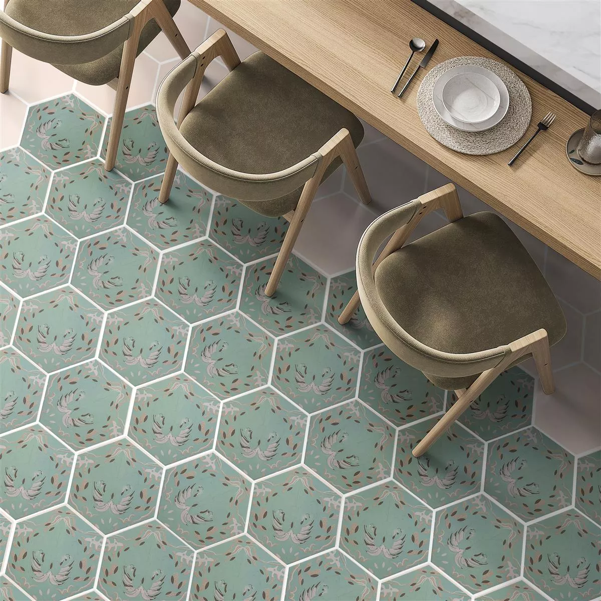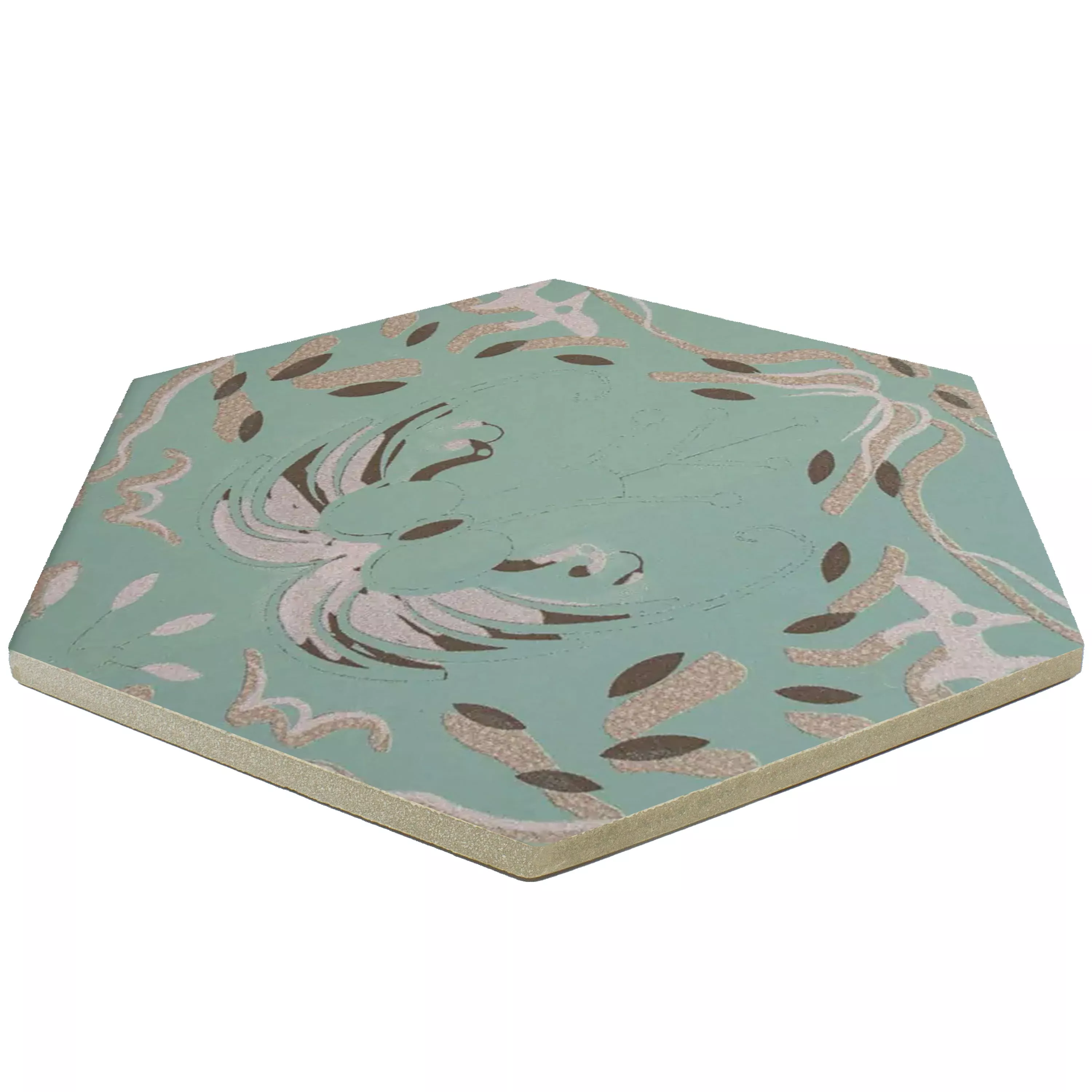 Le piastrelle in gres porcellanato “Modena Hexagon Decor 5” offrono un'armoniosa fusione tra funzionalità e design estetico. Con uno spessore di 10 mm sono ideali per zone umide, docce, bagni, cucine, soggiorni e ambienti interni. La superficie opaca e il motivo ornamentale floreale in verde conferiscono alle piastrelle un'eleganza senza tempo.