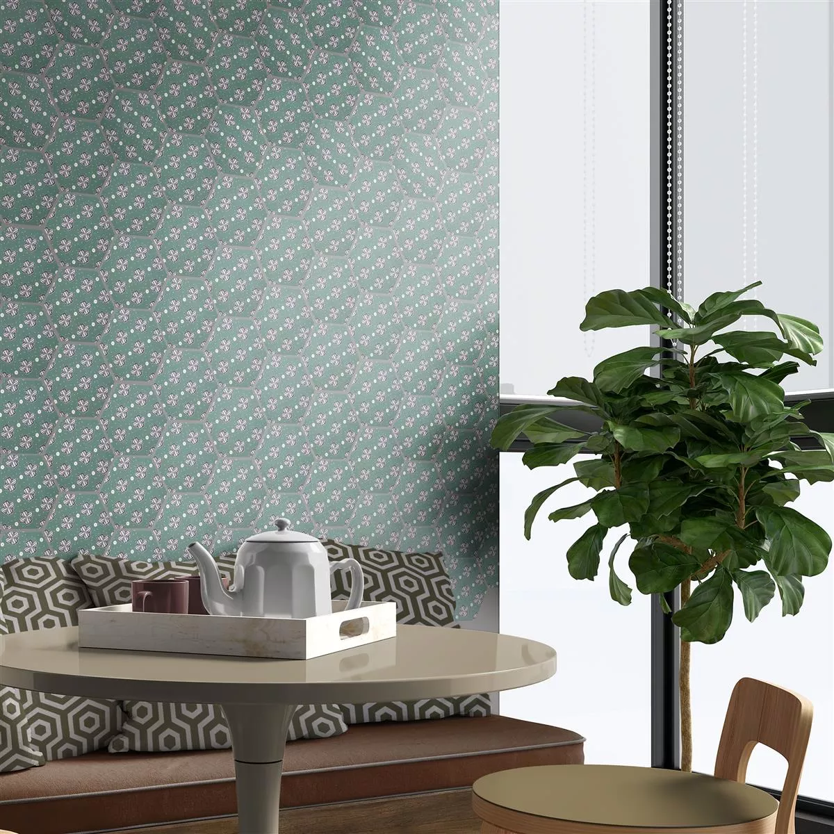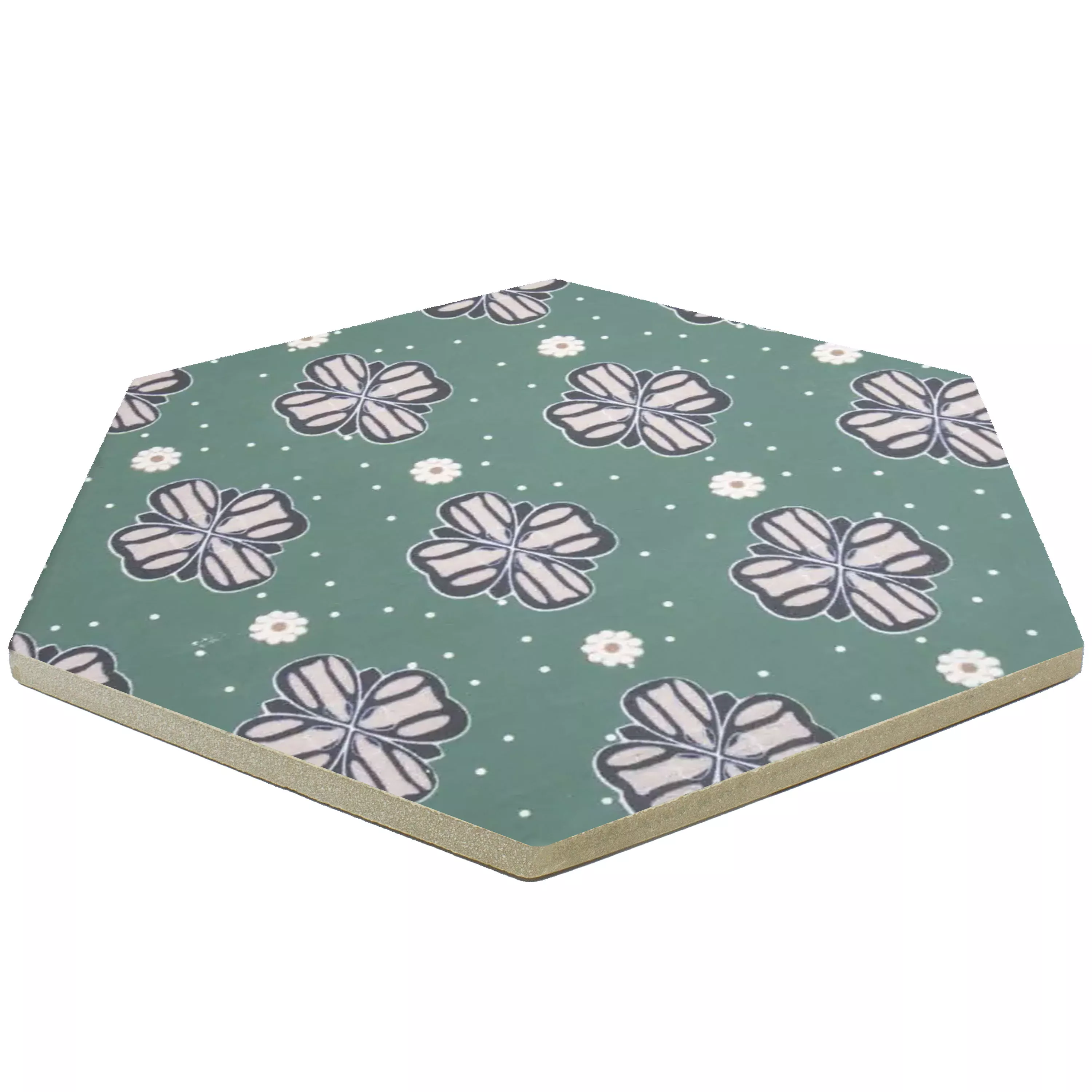 Le piastrelle in gres porcellanato “Modena Hexagon Decor 7” uniscono un design di grande impatto ad un'elevata funzionalità. Con uno spessore di 10 mm sono perfetti per zone umide, docce, bagni, cucine, soggiorni e ambienti interni. La superficie opaca, in un attraente verde con ornamenti floreali, conferisce alle piastrelle un aspetto elegante e senza tempo.