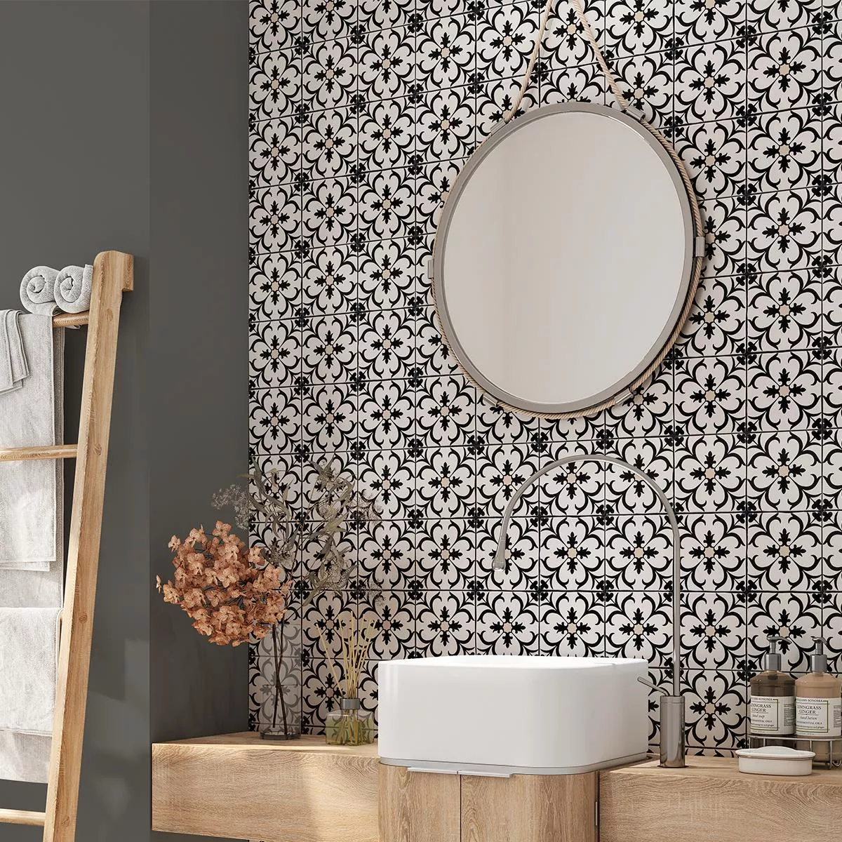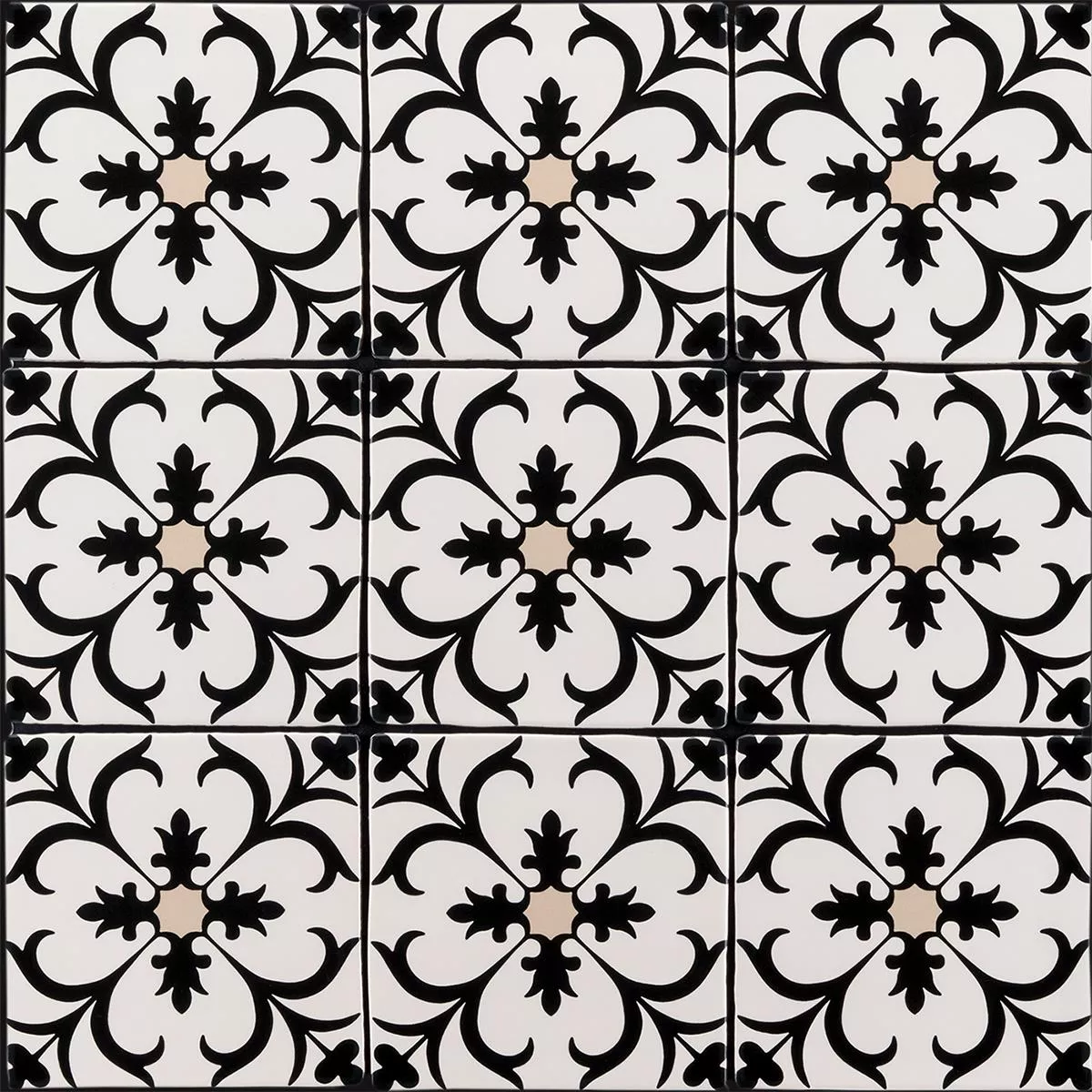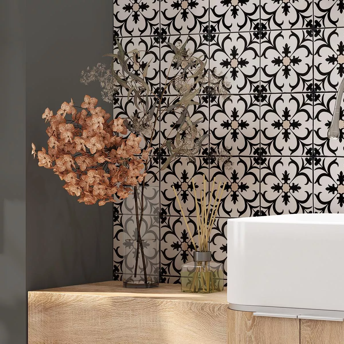 I pavimenti effetto fiore Ornamenti Trieste donano ai tuoi interni un mix armonioso di nero, beige e bianco. La superficie opaca e lo spessore di 8 mm conferiscono loro una struttura robusta.