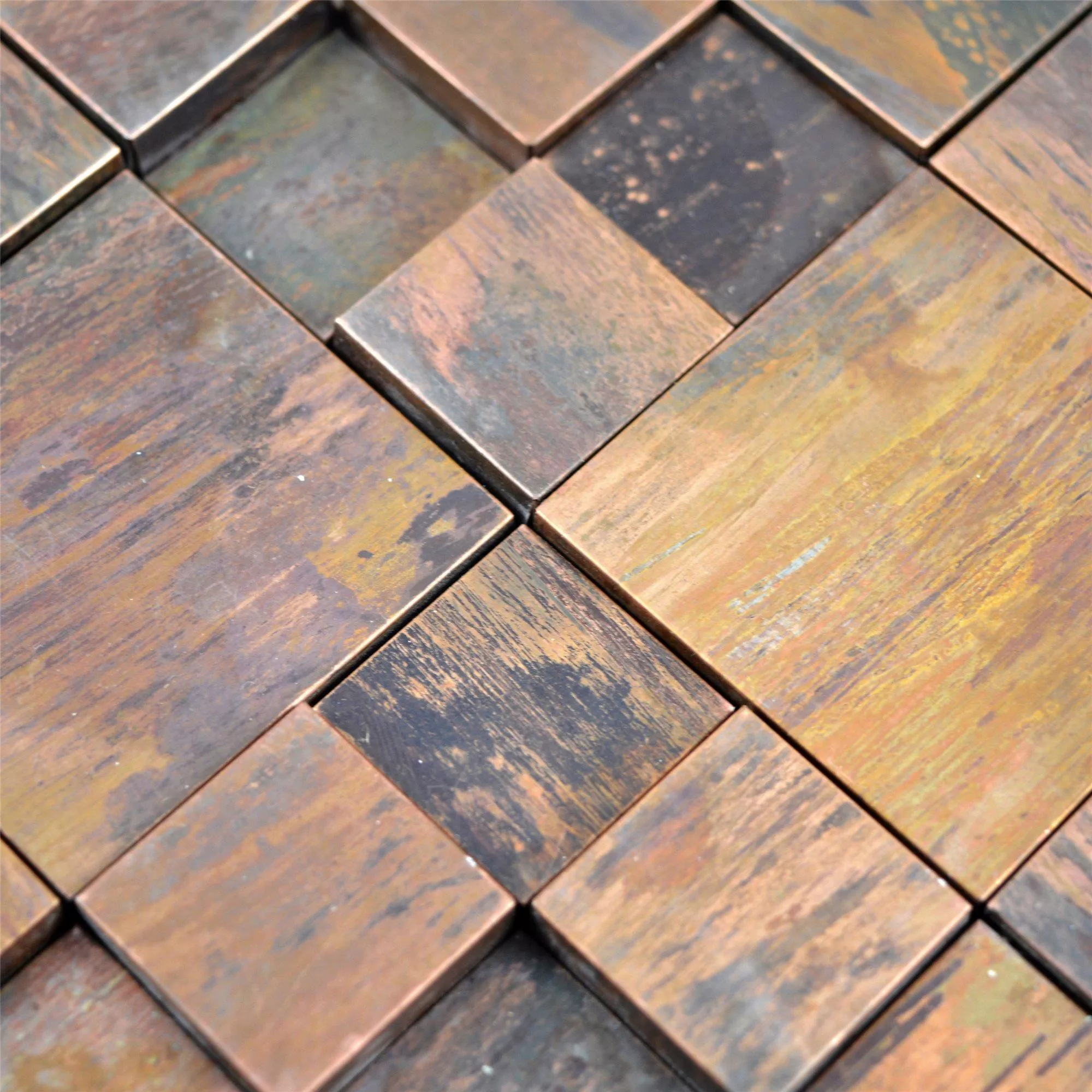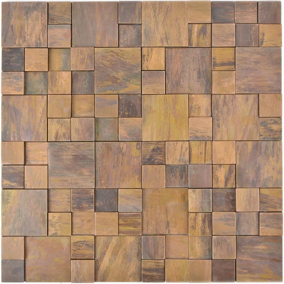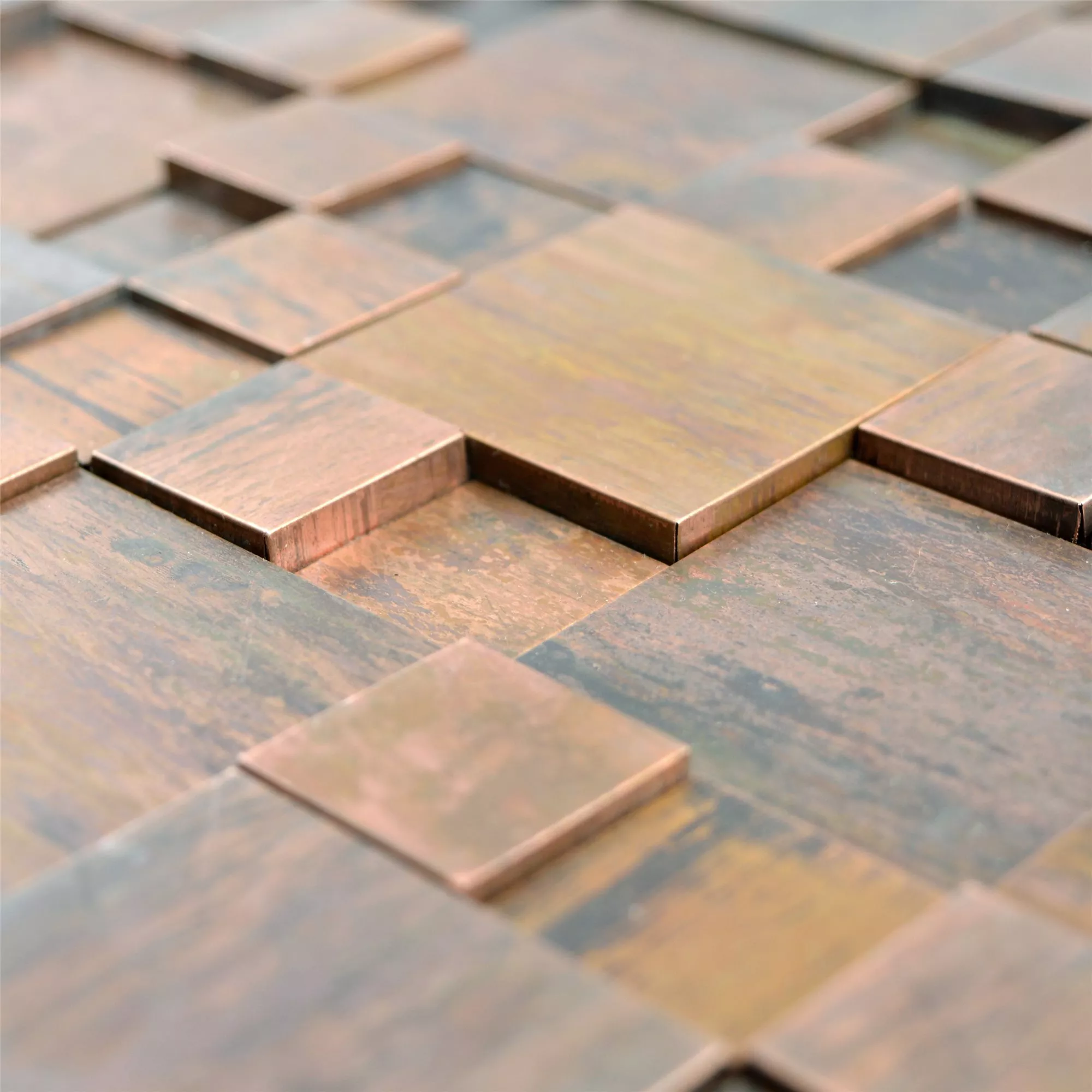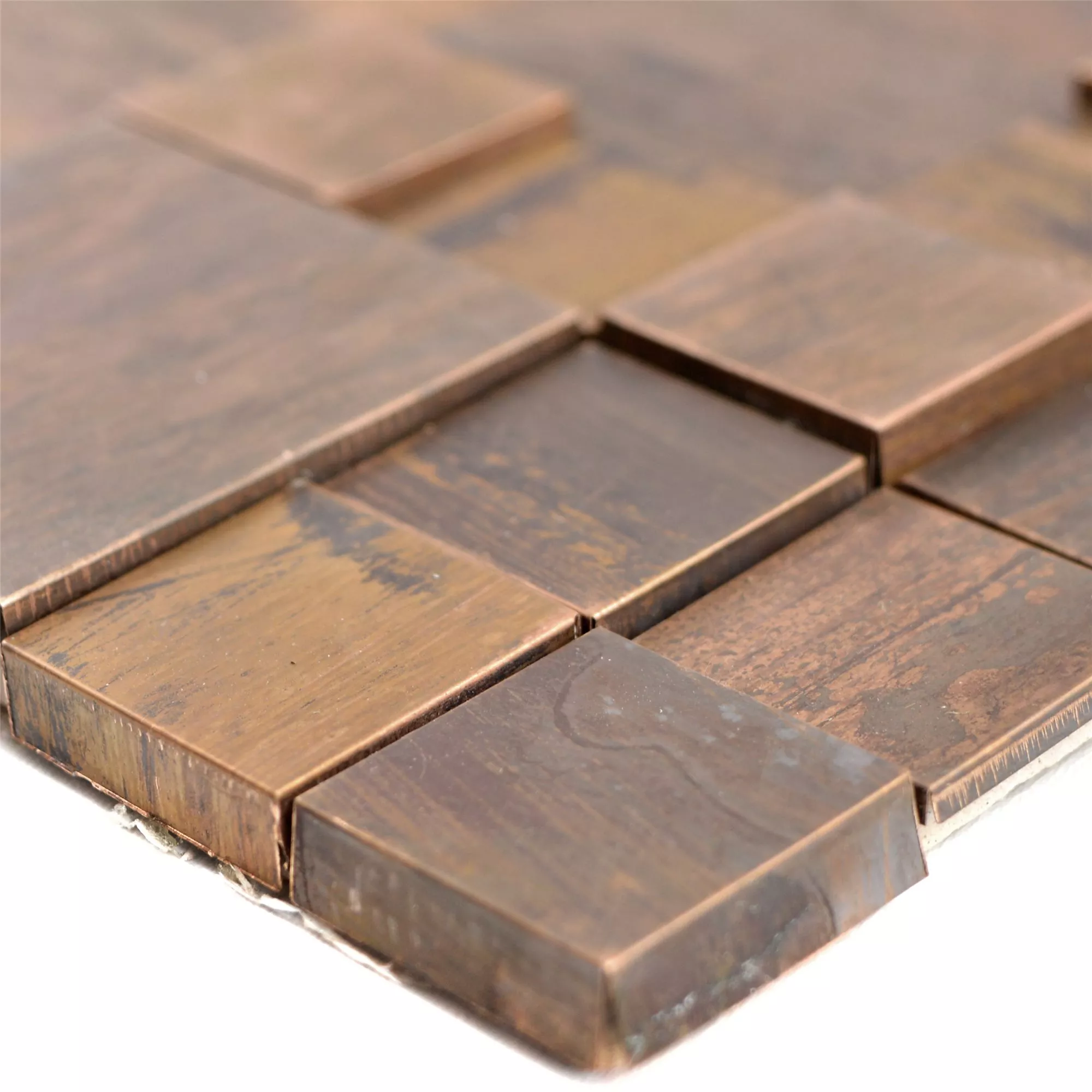 Le piastrelle a mosaico 3D Myron Kombi nell'elegante marrone combinano rame e metallo di alta qualità con un design moderno e tridimensionale. Queste piastrelle sono appositamente progettate per le pareti e offrono una combinazione unica di aspetto 3D e aspetto metallico che conferisce a qualsiasi stanza un aspetto lussuoso.