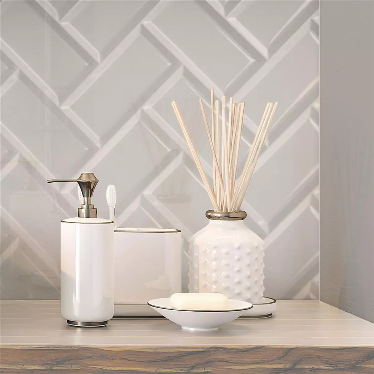 I rivestimenti Metro “Heliopolis Facette White” uniscono l'eleganza senza tempo con un tocco di fascino retrò. Ogni confezione (1m²) è composta da 88 piastrelle in gres smaltato di formato rettangolare (7,5x15cm), che colpiscono per la superficie lucida e il design sfaccettato.