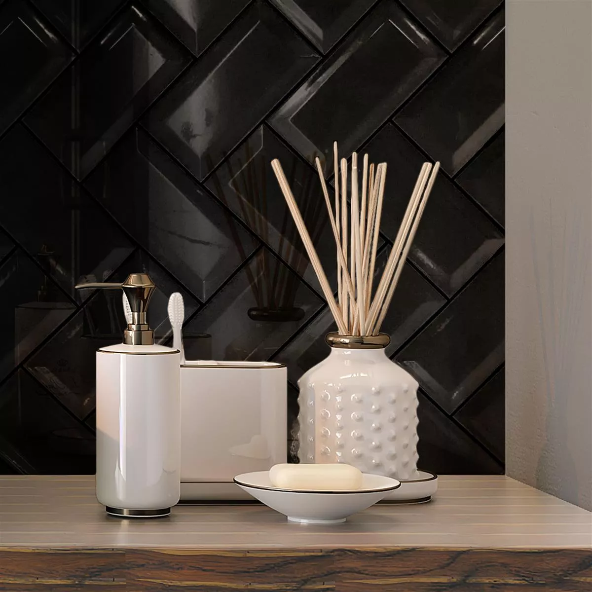 Il rivestimento Metro "Heliopolis Facette Black" porta nella vostra casa il fascino dell'eleganza classica. La confezione da 1 m² contiene 88 piastrelle in gres smaltato non rettificato di formato rettangolare (7,5x15 cm), che colpiscono per la superficie lucida e lo spessore di 10 mm.