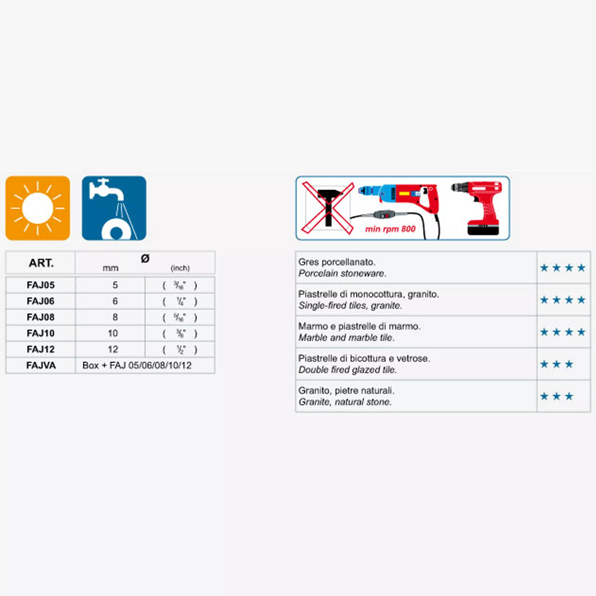 Se si desidera utilizzare la corona diamantata è necessario un trapano con almeno 800 giri al minuto o più. La punta diamantata Mondrillo è disponibile in 5 diverse misure. Il cliente può scegliere tra i diametri 5, 6, 8, 10 e 12 mm. Gli utensili diamantati come questo sono considerati particolarmente duri e sono progettati per un'ampia varietà di lavori. Sebbene questo utensile diamantato sia adatto per la perforazione a secco, esistono altri utensili che possono essere utilizzati per la perforazione a umido. Quando acquisti una punta da trapano e un utensile diamantato, dovresti prestare attenzione all'alta qualità e alla lavorazione impeccabile. Lo strumento qui presentato deve essere utilizzato con un trapano adatto o compatibile.