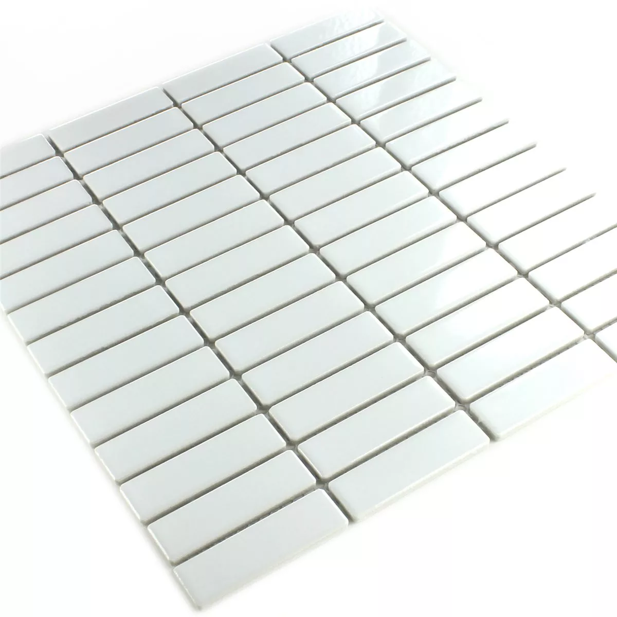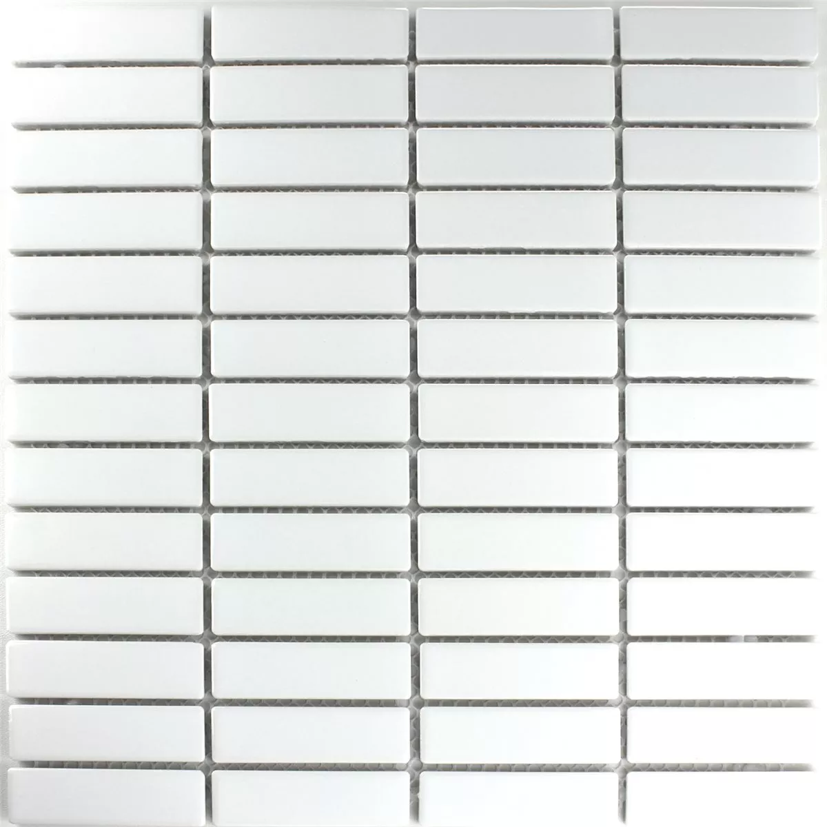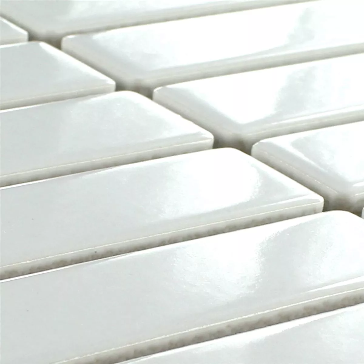 La piastrella in mosaico ceramico, nel colore bianco uni e finitura superficiale lucida, ha una dimensione opaca di 298x318 mm e una dimensione della pietra di 21,9x72,8 mm. Lo spessore di ogni pietra è di 0,6 cm.