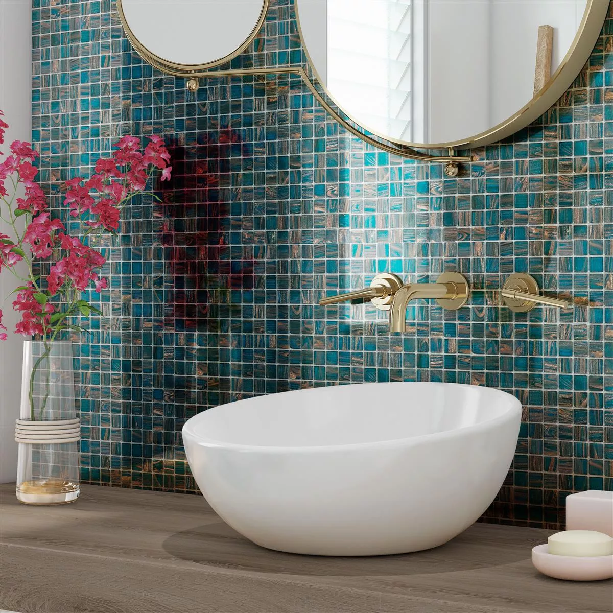 Perfette per bagni, cucine, ambienti interni e docce, queste piastrelle versatili sono progettate specificatamente per le aree umide. Dai alla tua stanza una combinazione di colori calma ma impressionante con le piastrelle a mosaico in vetro Kyoto Petrol Blue.