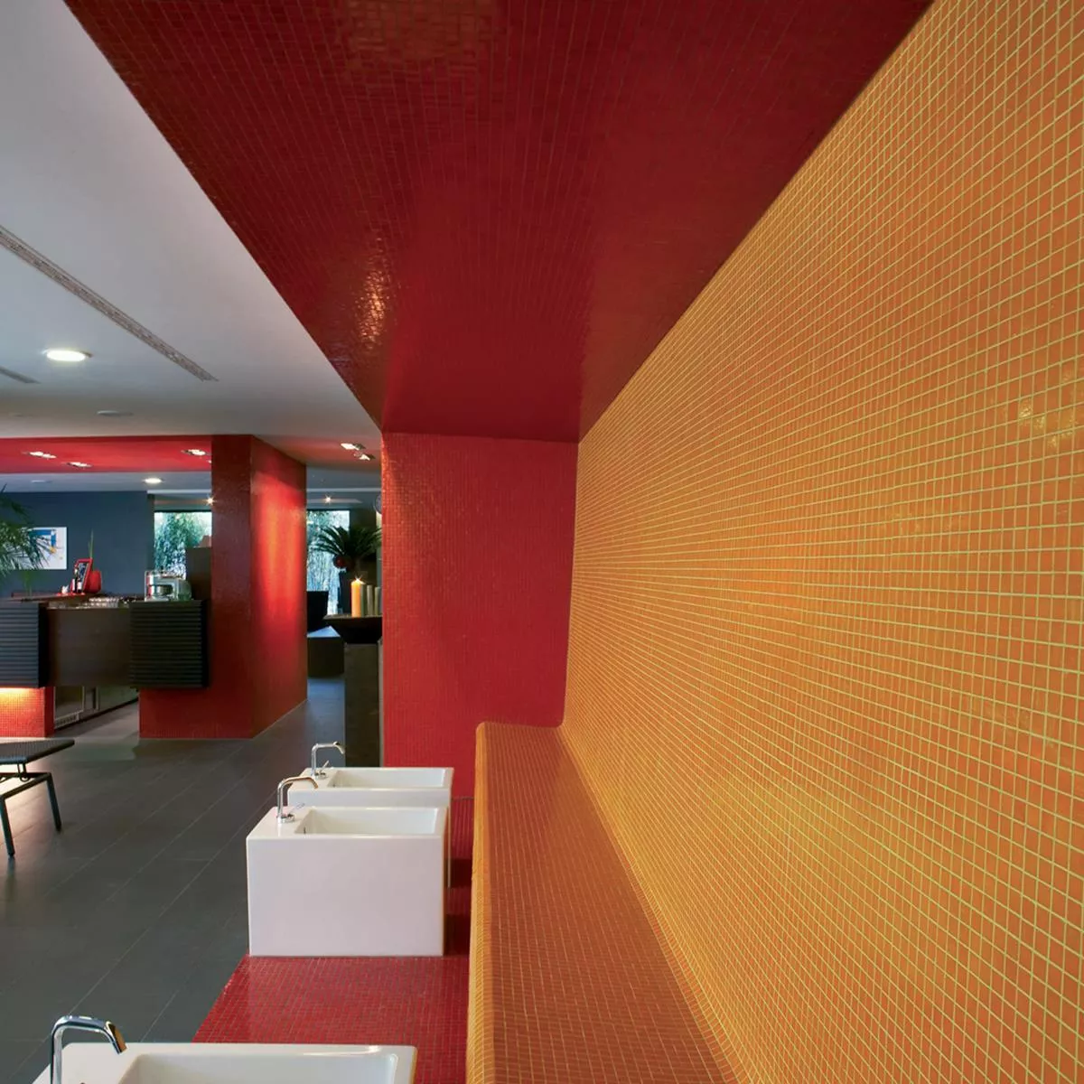 Dentro e intorno alle piscine, dove le piastrelle sono continuamente esposte all'umidità, offrono la resistenza necessaria.