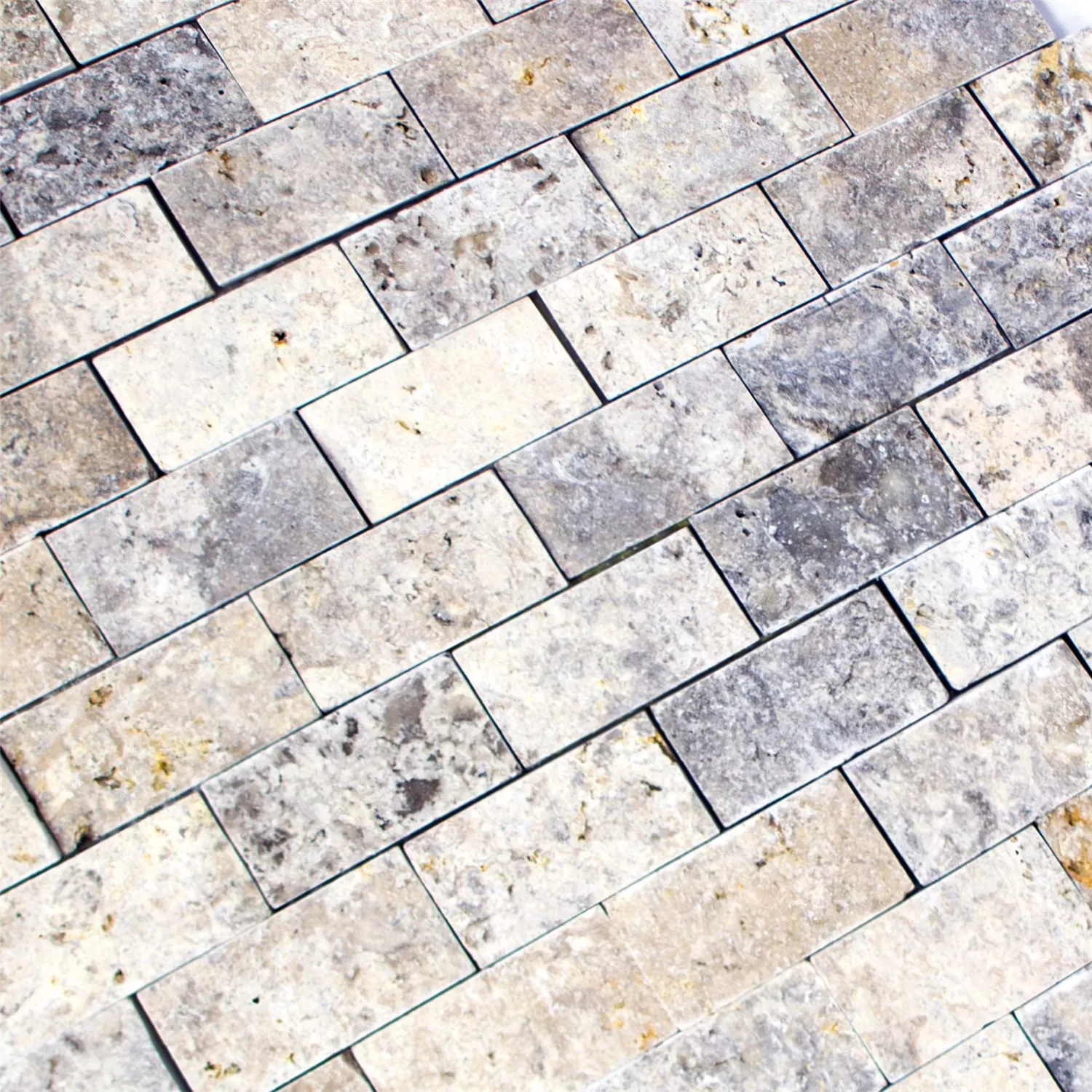 Queste tessere di mosaico Nestor Silver 3D realizzate in robusto materiale naturale travertino sono ritagliate direttamente dalla pietra. La pietra sembra leggermente argentata luccicante. Sono ottimi per tutti gli spazi esterni. Il materiale è leggermente strutturato. Ciò garantisce che l'acqua sulle pietre possa defluire rapidamente, rendendo la superficie difficile da calpestare rapidamente. Anche con il gelo, la pietra non diventa liscia con una leggera umidità, ma può comunque essere utilizzata.