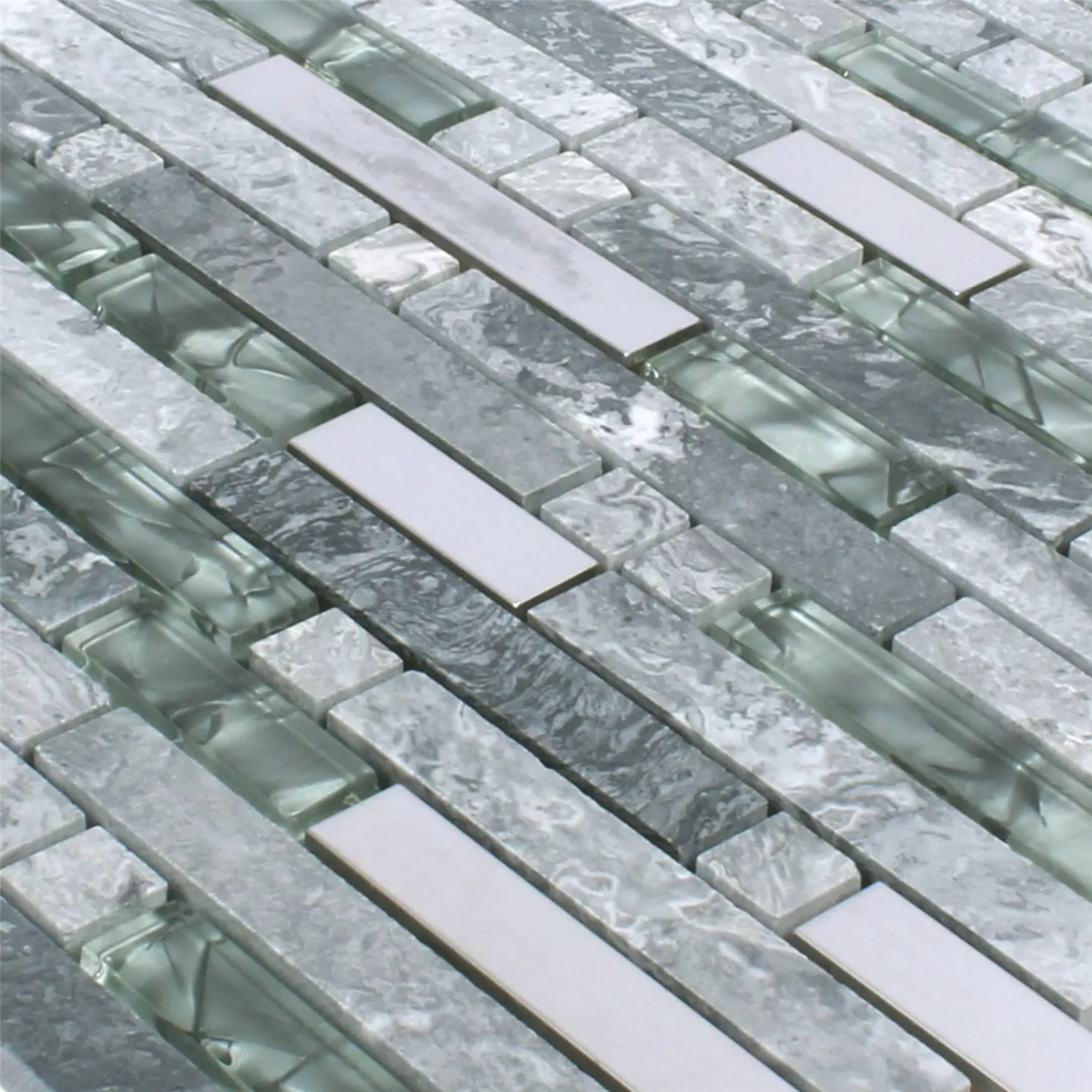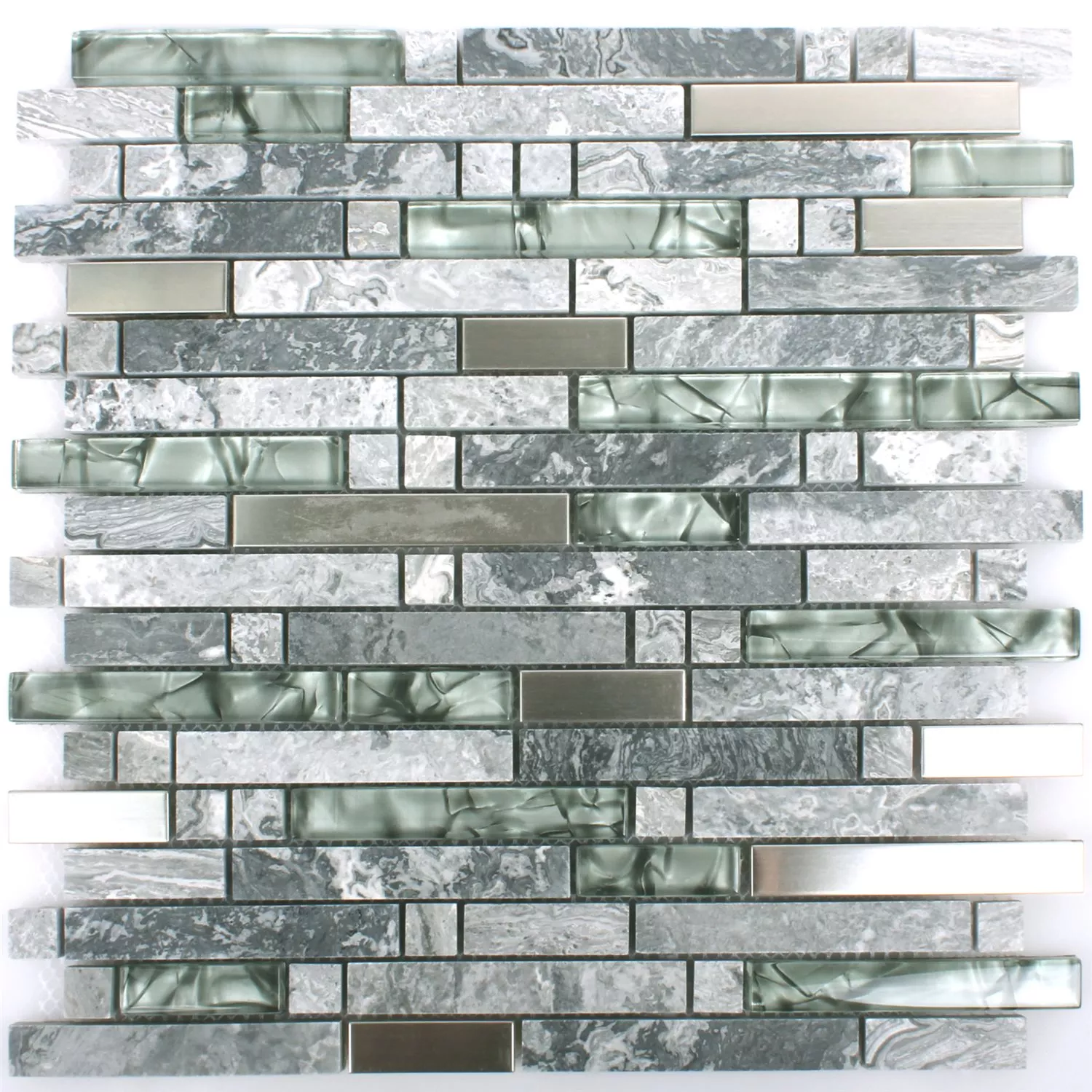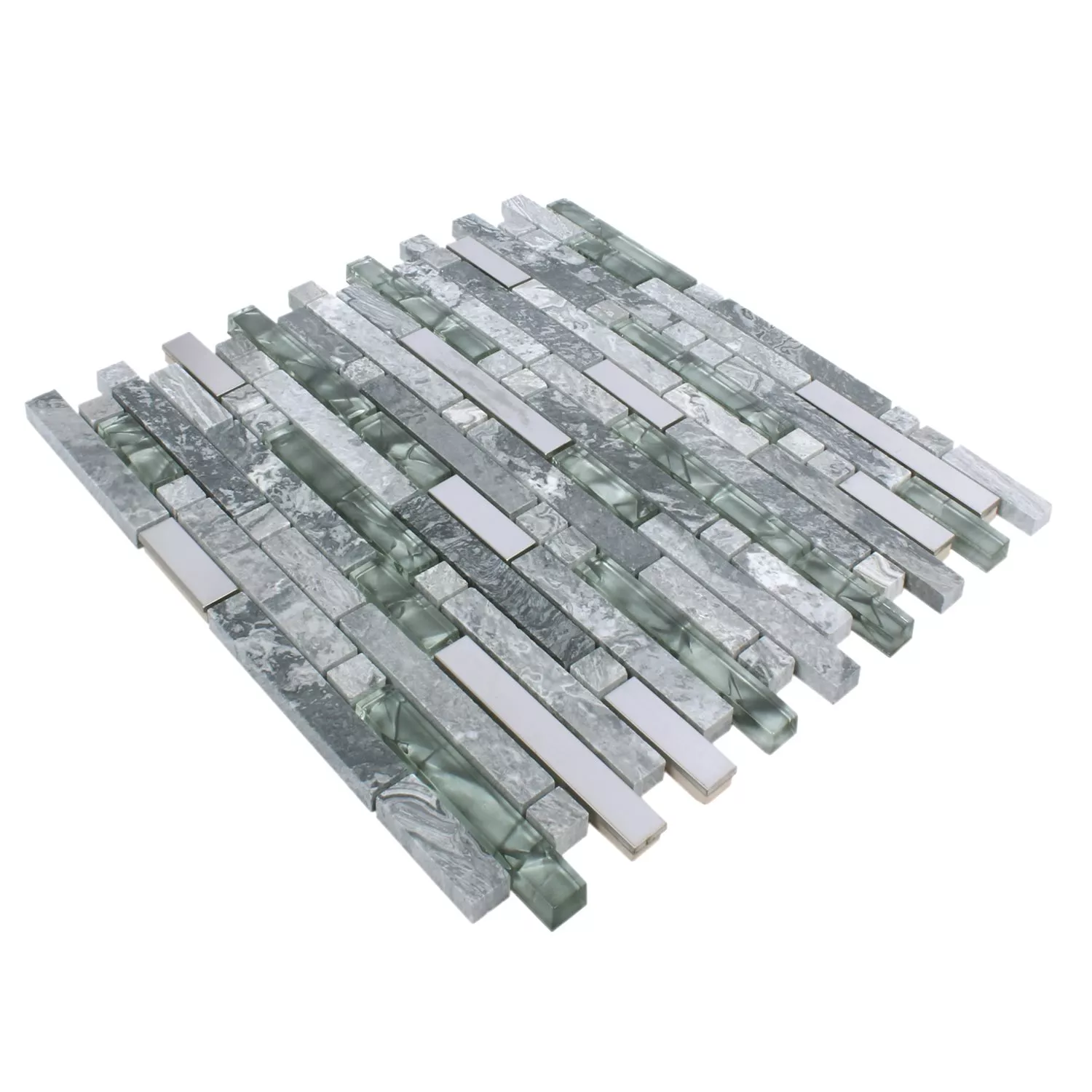 Il mix di queste insolite tessere di mosaico è spazzolato, lucido e levigato. Il mix di materiali è in stile asiatico e grigio. Nel complesso vengono lavorate pietre naturali, vetro e acciaio inossidabile. Tutte le parti sono rettangolari, le pietre sono naturali. Il vetro brilla in grigio lucido accanto all'acciaio inossidabile leggermente spazzolato. Tutte le piastrelle sono posate su un tappetino e possono quindi essere lavorate molto facilmente. Una combinazione con più tappetini è possibile senza problemi. Le tessere di mosaico sono particolarmente indicate come rivestimenti per pareti.