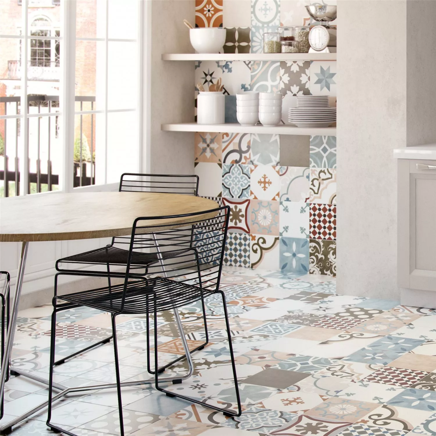 Wow: questo urlo si sentirà più spesso quando i visitatori entrano nella stanza. Le cementine 45x45 cm offrono all'occhio una disposizione giocosa di varie figure geometriche. Sebbene la colorazione possa essere descritta come colorata, colpisce per la sua moderazione. Pertanto, questa piastrella in cemento retrò Artemis ha un aspetto altrettanto elegante sul pavimento come su una piastrella da rivestimento.