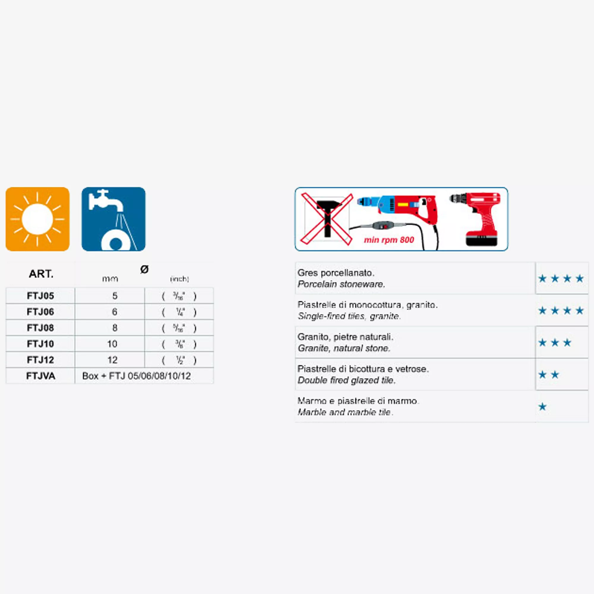 La punta con diamante è adatta per un trapano con 800 giri al minuto o più. La corona non è applicabile a velocità inferiori. Garantisce un taglio netto e cerca di evitare crepe nelle piastrelle. Ogni taglia è disponibile singolarmente. Per distinguerlo facilmente dagli altri produttori, è stato dipinto di verde. Le dimensioni individuali hanno un diametro di 5 mm, 6 mm, 8 mm, 10 mm e 12 mm. Per ottenere i migliori risultati, si consiglia di pulire preventivamente le superfici. Le piastrelle possono essere lavorate sia singolarmente che installate a parete. L'aggiunta di un po' d'acqua alla punta del trapano impedisce il surriscaldamento. Il diamante è di lunga durata e può essere utilizzato molto bene molte volte.
