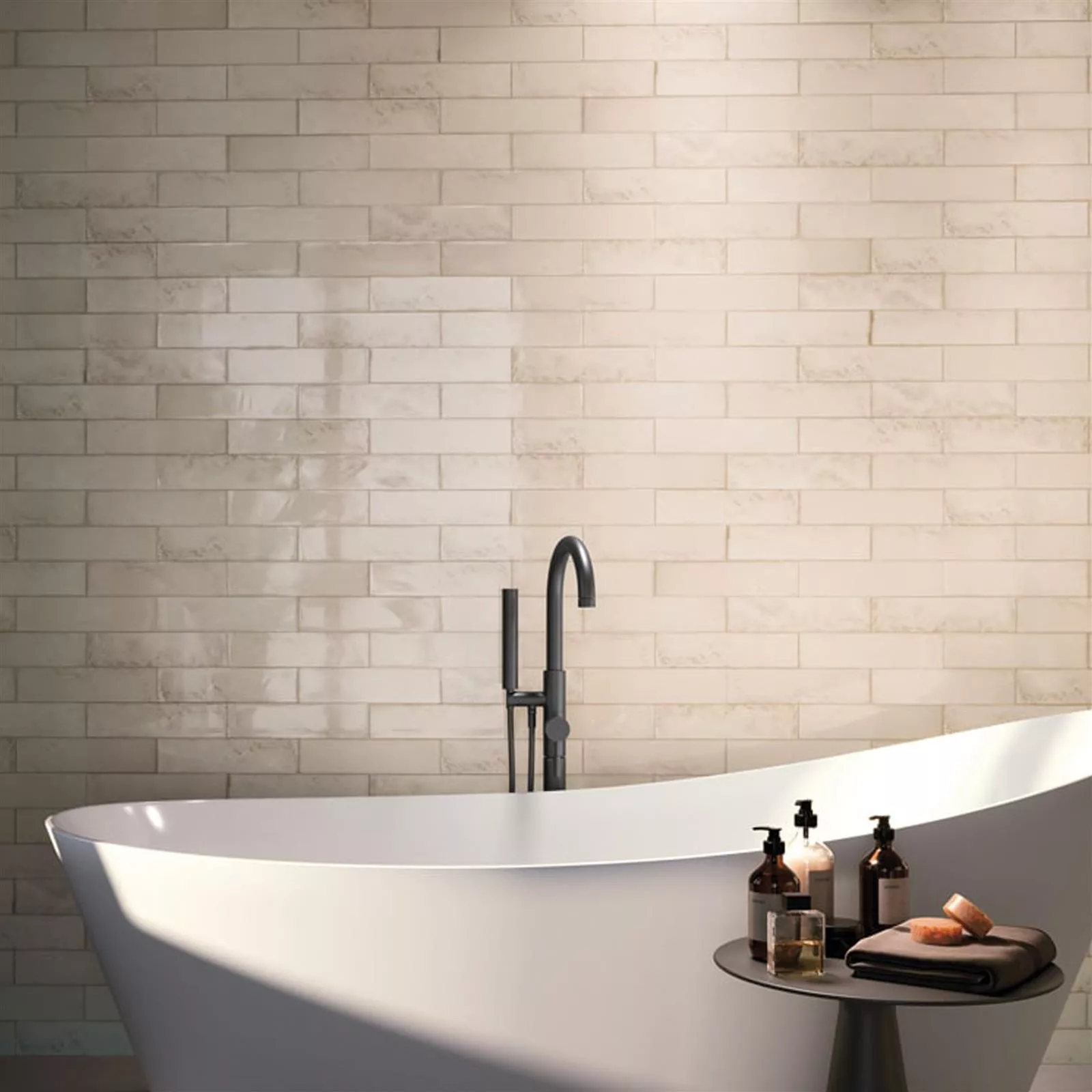 Il rivestimento First in avorio è versatile. Offre una finitura lucida e ondulata. Piastrella in gres con bordo naturale, smaltata.