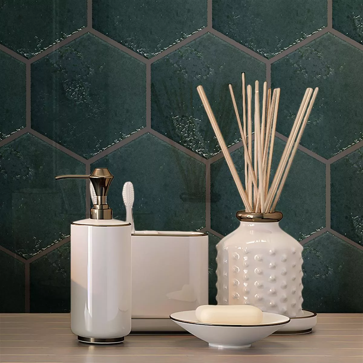 Con uno spessore di 7 mm, la piastrella è robusta e versatile, ideale per bagni, docce, cucine e soggiorni. Il formato esagonale (13 x 15 cm) consente un design moderno e geometrico e dona alle tue pareti una struttura elegante.