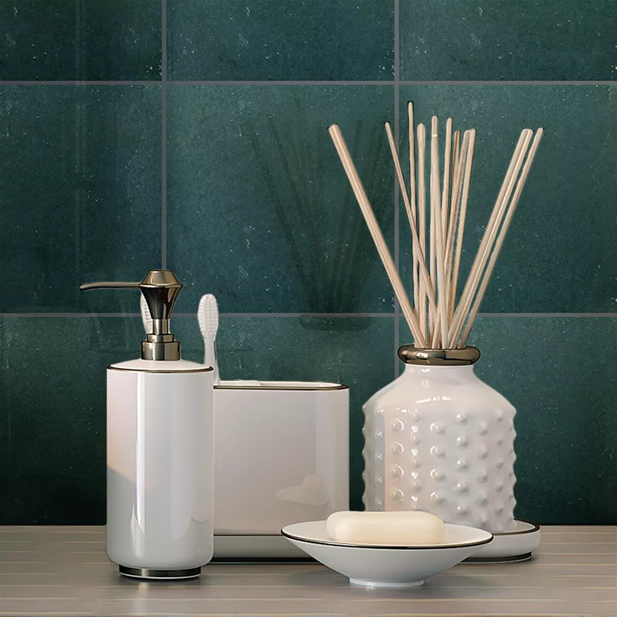 Il rivestimento Lara in un elegante verde dona un tocco fresco e naturale a qualsiasi stanza. Realizzato in gres di alta qualità, colpisce per la sua superficie lucida e leggermente ondulata, che riflette un elegante aspetto della pietra naturale in stile vintage. Il bordo non rettificato e il bordo naturale conferiscono alla piastrella un fascino autentico e rustico, mentre lo smalto garantisce una superficie robusta e di facile manutenzione.