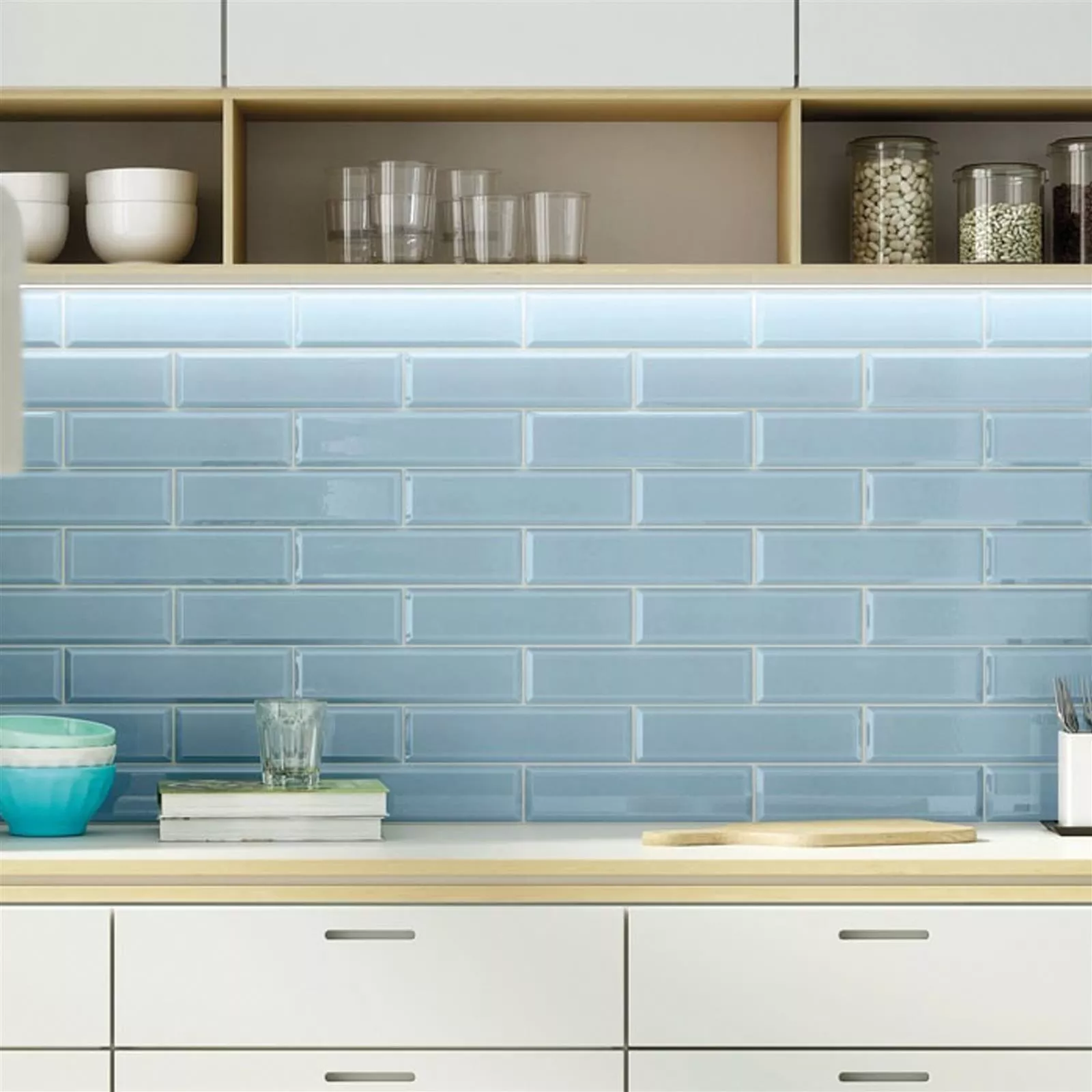 Rivestimento Studio Facette Glossy 7,5x30cm nel colore azzurro. Il rivestimento Studio Facette Glossy ha un effetto molto gradevole e ha una forma allungata con le dimensioni 7,5x30 cm. Realizzata in robusta terracotta con un bordo naturale, questa piastrella presenta una finitura brillante e brillante.