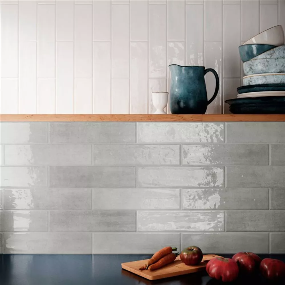 Queste piastrelle rettangolari smaltate che misurano 7,5x30 cm e 8,4 mm di spessore donano un'estetica vintage alle tue stanze. La superficie ondulata e lucida conferisce alle vostre pareti una sottile dinamica.