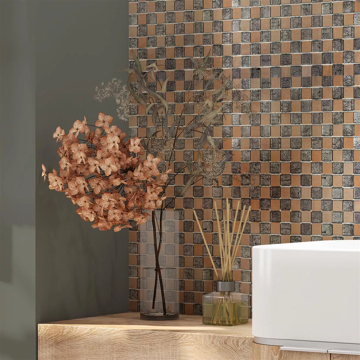 Le tessere mosaico grigio rame Eldorien aggiungono un tocco di raffinatezza ed eleganza ai vostri ambienti. La combinazione di grigio e rame crea un contrasto elegante che conferisce accenti moderni.