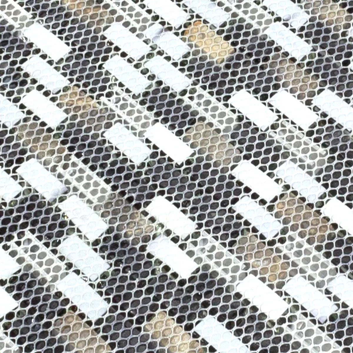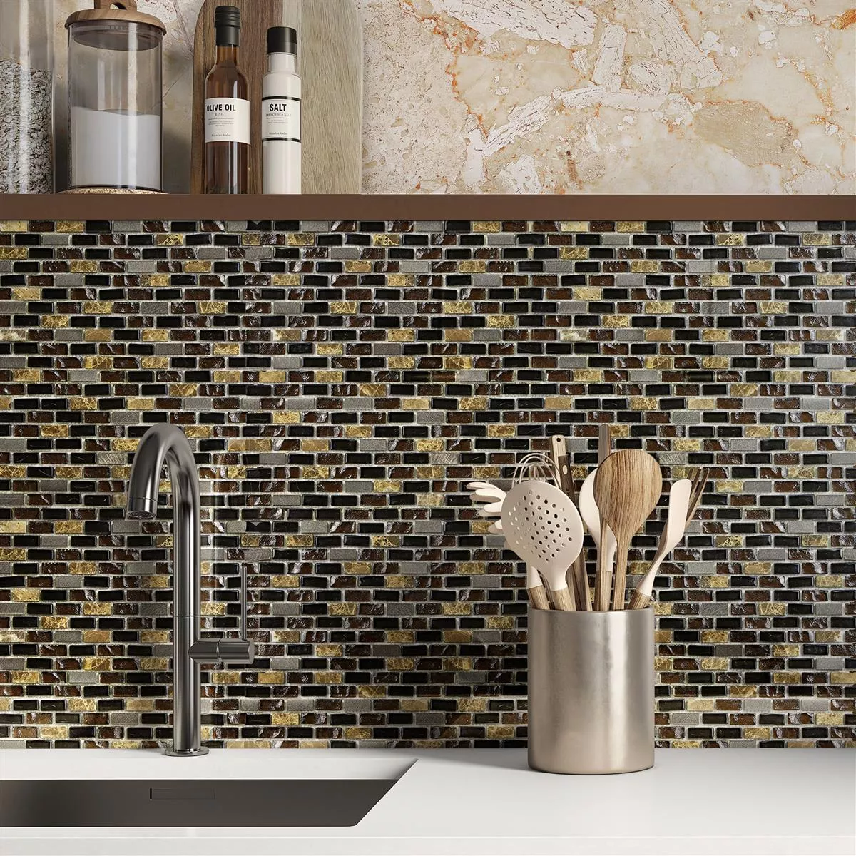 Immergiti nell'eleganza sofisticata con le piastrelle a mosaico in vetro marmo alluminio Patterson Brown Mix. L'audace combinazione di nero, argento e marrone, abbinata a una superficie variegata opaca e lucida, crea un look moderno. Queste tessere di mosaico, realizzate in alluminio, marmo, metallo e vetro, offrono non solo raffinatezza visiva ma anche una sofisticata combinazione di materiali.