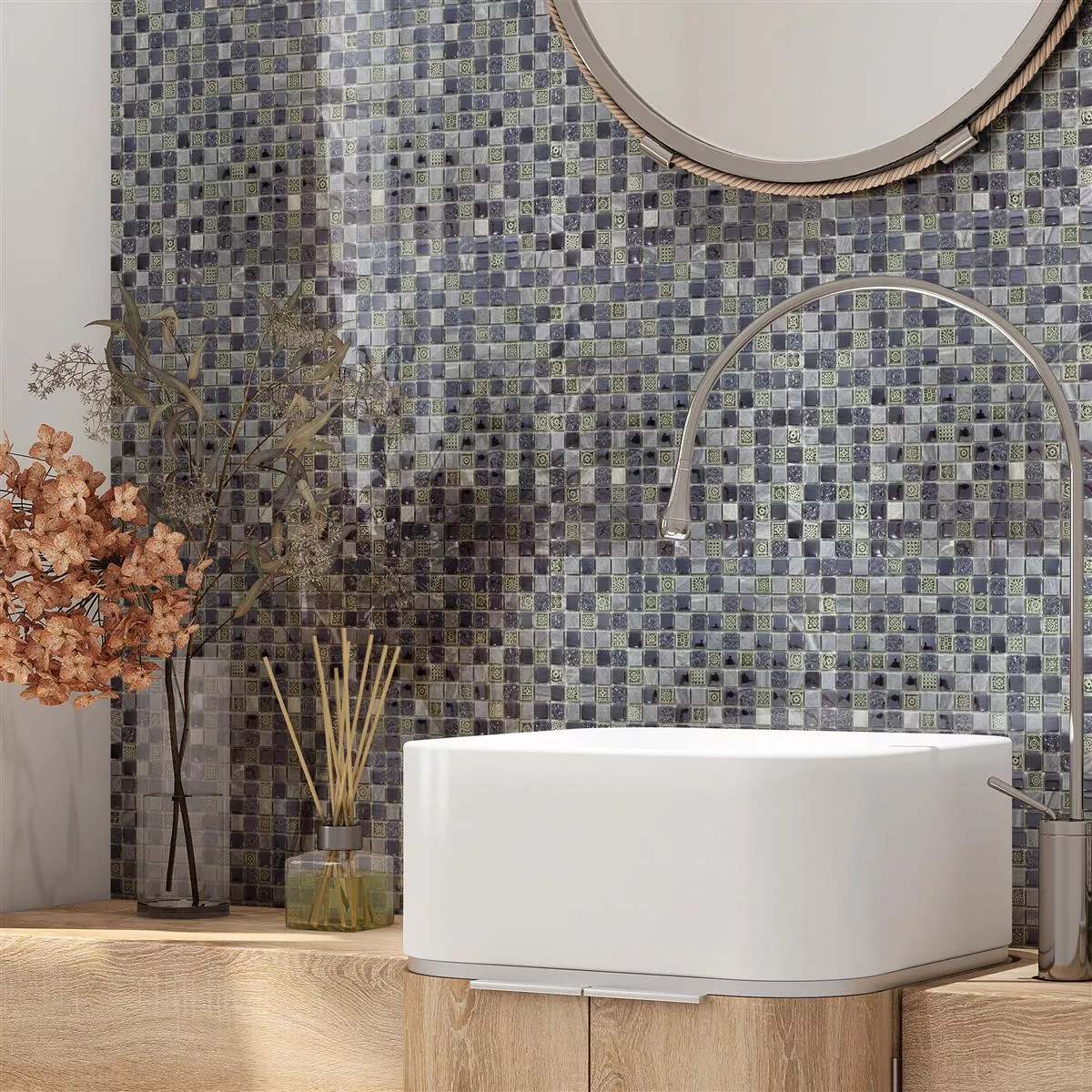 Scopri il lusso moderno con le piastrelle a mosaico in marmo e vetro Champion Black Grey Mix. L'elegante combinazione di grigio e nero, abbinata a una superficie varia di opaco, lucido e strutturato, crea un look contemporaneo. Queste tessere di mosaico, realizzate in pietra naturale, marmo e vetro, offrono non solo raffinatezza visiva ma anche robustezza.