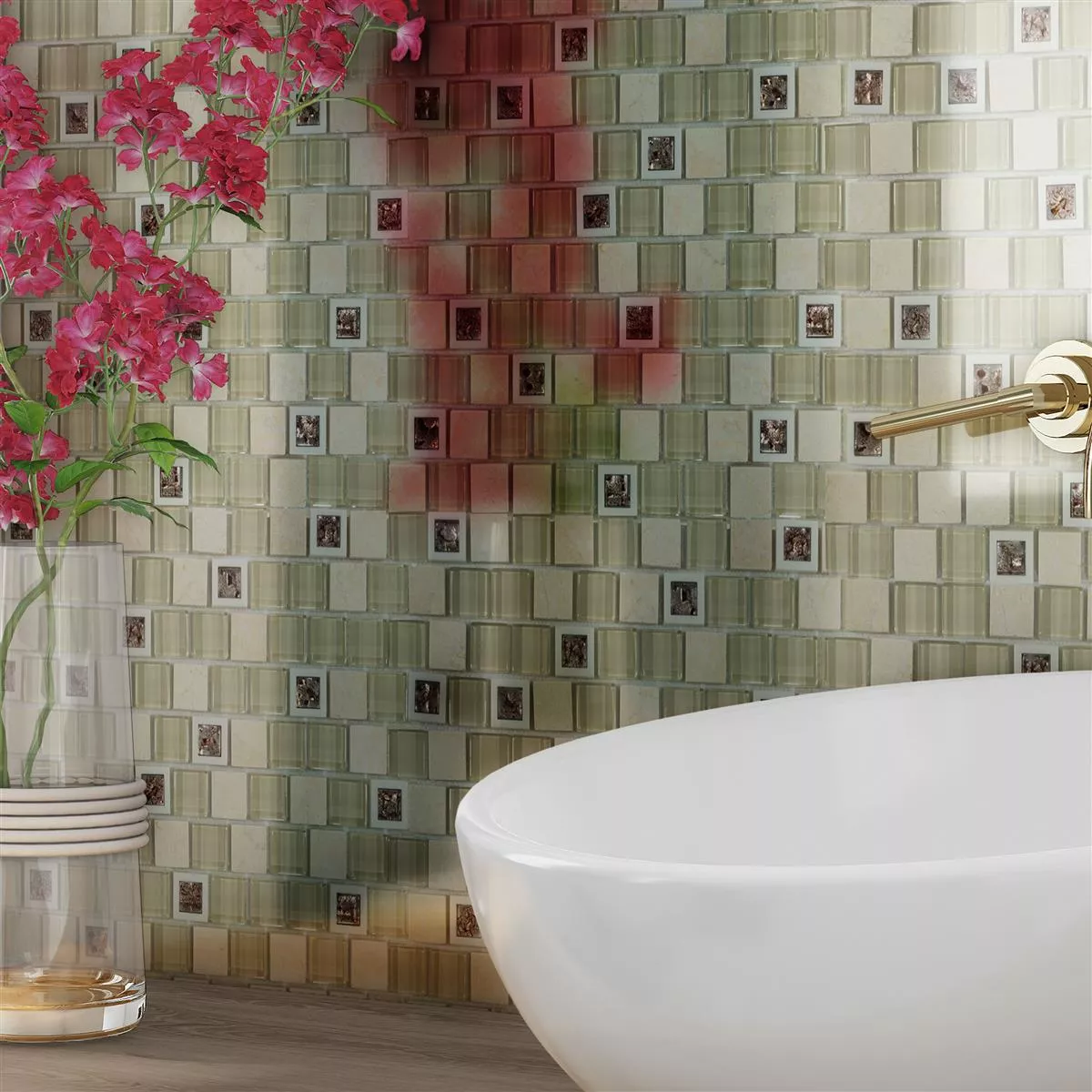 I diversi materiali - marmo, vetro, plastica e pietra naturale - conferiscono a queste piastrelle una texture affascinante e una finitura lucida. La dimensione della pietra di 23x23 mm aggiunge una dimensione interessante all'area.