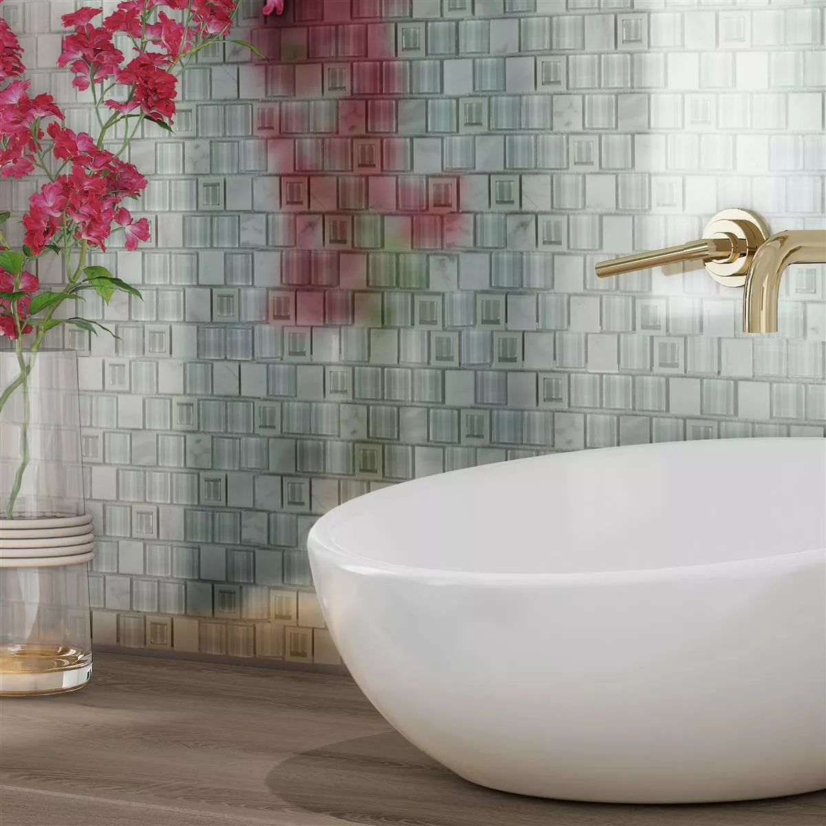 I diversi materiali - marmo, vetro, plastica e pietra naturale - conferiscono a queste piastrelle una texture affascinante e una finitura lucida. La dimensione della pietra di 23x23 mm aggiunge una dimensione interessante all'area.